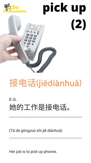 接 (jiē) has multiple meanings, but in this case, we’re referring to 接电话 (jiē diànhuà), which means to pick up a phone call. In case you’re wondering, “to hang up” is 挂电话 (guà diànhuà).