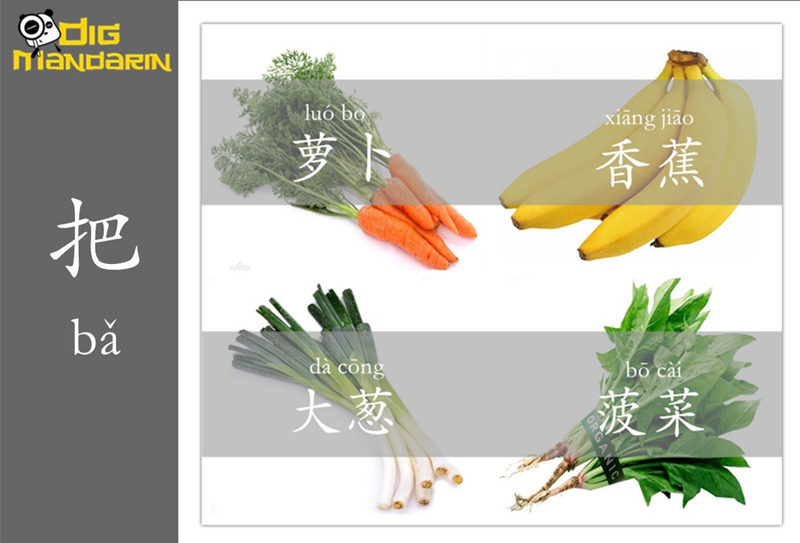 3. 把 can be used to describe a bunch or bundle of things of the same kind that are fastened together. For example, you can use 把 with 香蕉 (xiāngjiāo, bananas), 筷子 (kuàizi, chopsticks), 菠菜 (bōcài, spinach), 萝卜 (luóbo, radishes), 大葱 (dàcōng, scallions), and so on.