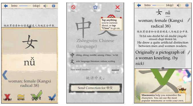 This app breaks down characters into their component parts. Then, they use images and a short story to help you remember these components. Most of the stories are ridiculous or funny enough to be memorable. Each tone is represented by a certain animal which helps you remember the character. It also teaches characters that build up from smaller to more complex characters in a logical way.