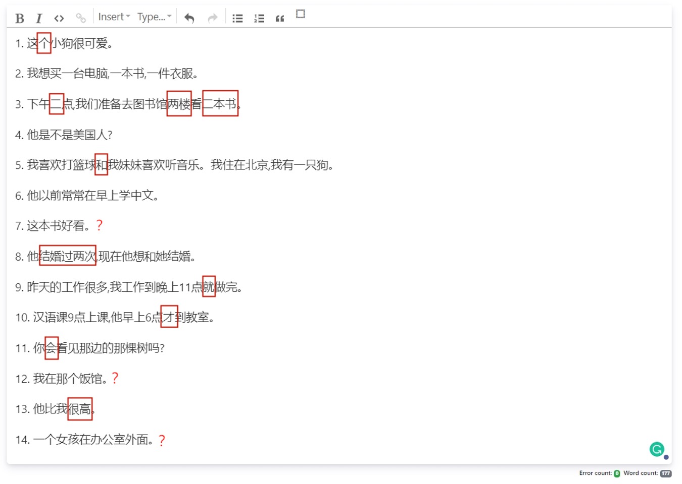 There are 19 suggested edits, and among them, four of them are about punctuation, which is irrelevant. The use of an adjective as the predicate in sentence 1 was successfully corrected, which changes “是” to “很”. The second sentence about measure words was fully corrected. However, the incorrect measure word in the first sentence wasn’t detected. Although sometimes we hear “这个小狗” in spoken language, it should be more formal and accurate if it’s in written Chinese. In sentences 7, 12, and 14, the corrected sentences are correct in terms of grammar, but it changed the whole meaning. So, the corrections here are not ideal. Sentence 5 is interesting. Since there are two instances of over-use of “和”, but it just detected one. In sentences 4 and 6, the use of yes/no questions and the use of “了” were both corrected correctly. All other sentences and grammar issues were not corrected successfully. Five grammar error types were detected in total.