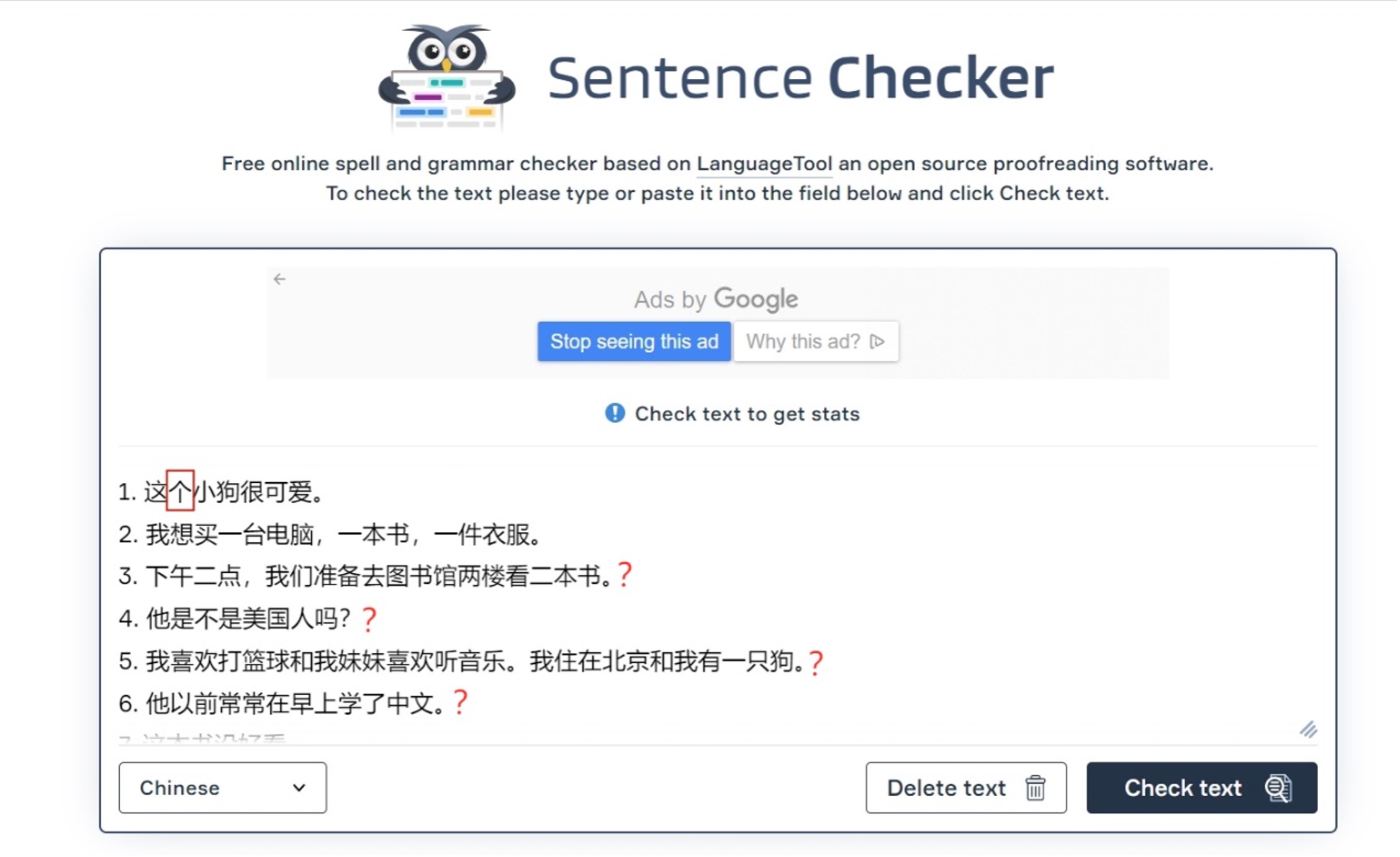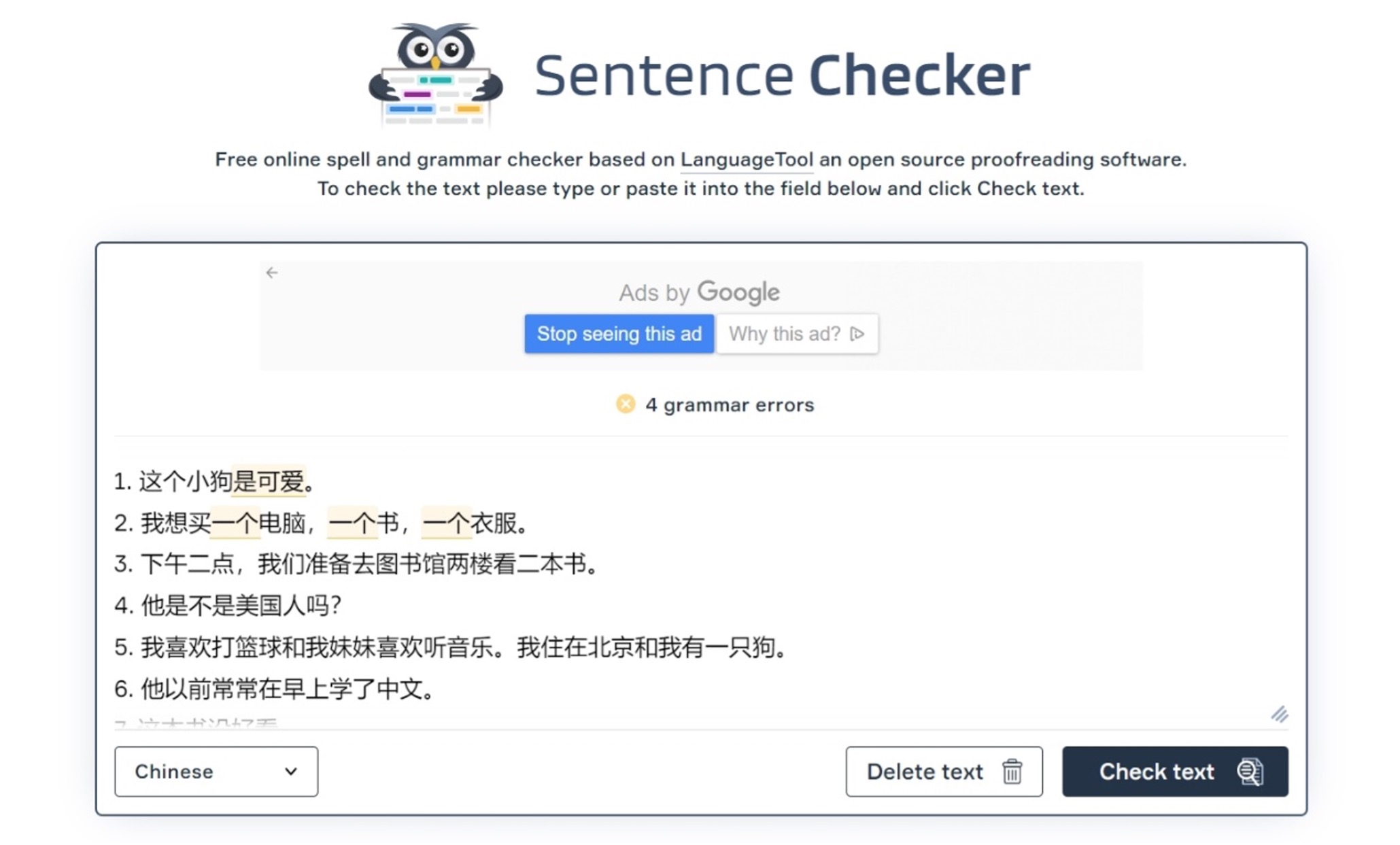 Sentence Checker detected four grammar errors, which are also presented on the surface. As the other checkers did, this one only corrected sentence 1 for the adjective functioning as the predicate, but the measure word problem remained. It did correct the measure words in sentence 2. All other grammar problems were not detected. In total, there are two types of grammar errors that were corrected.