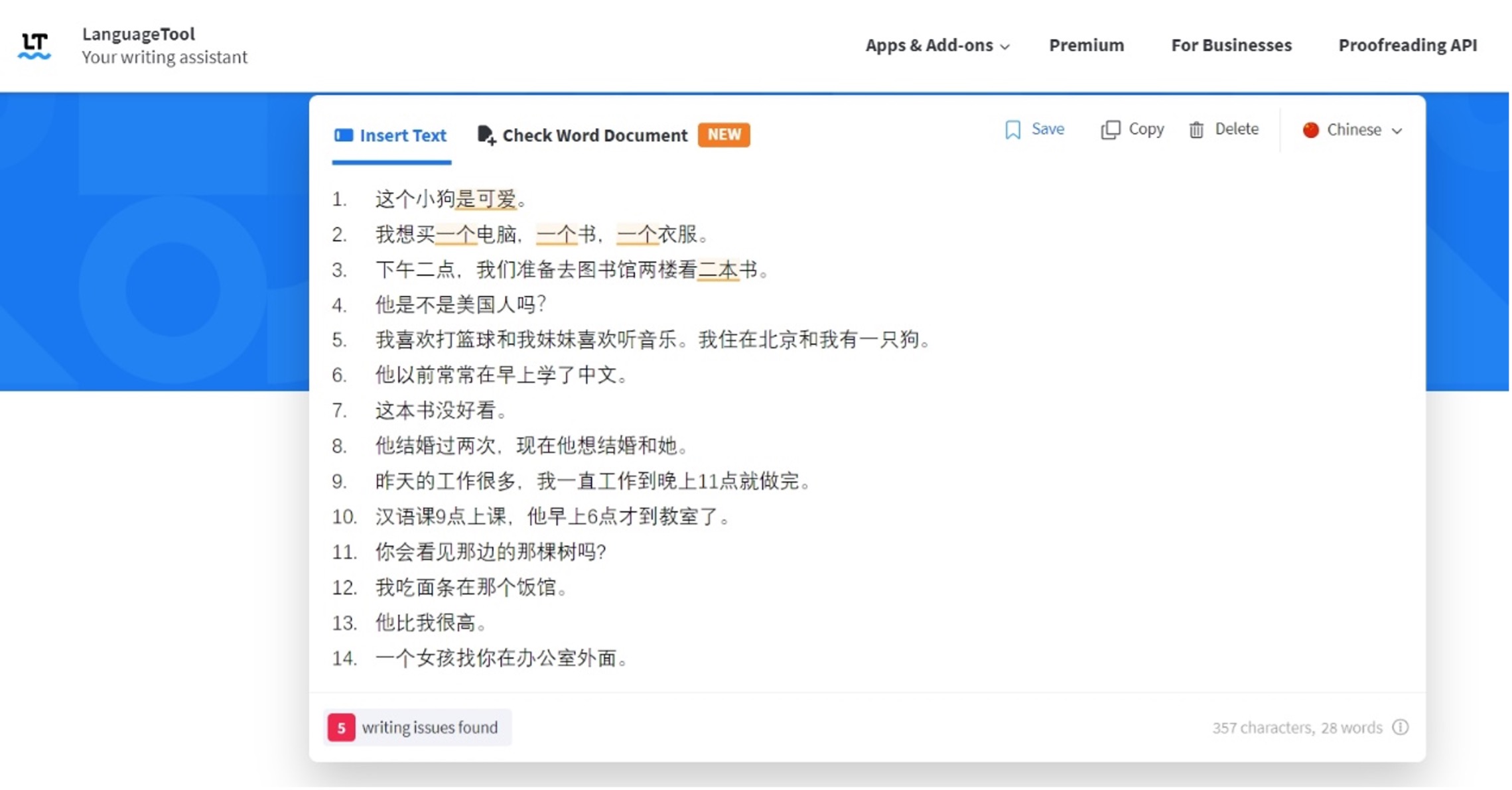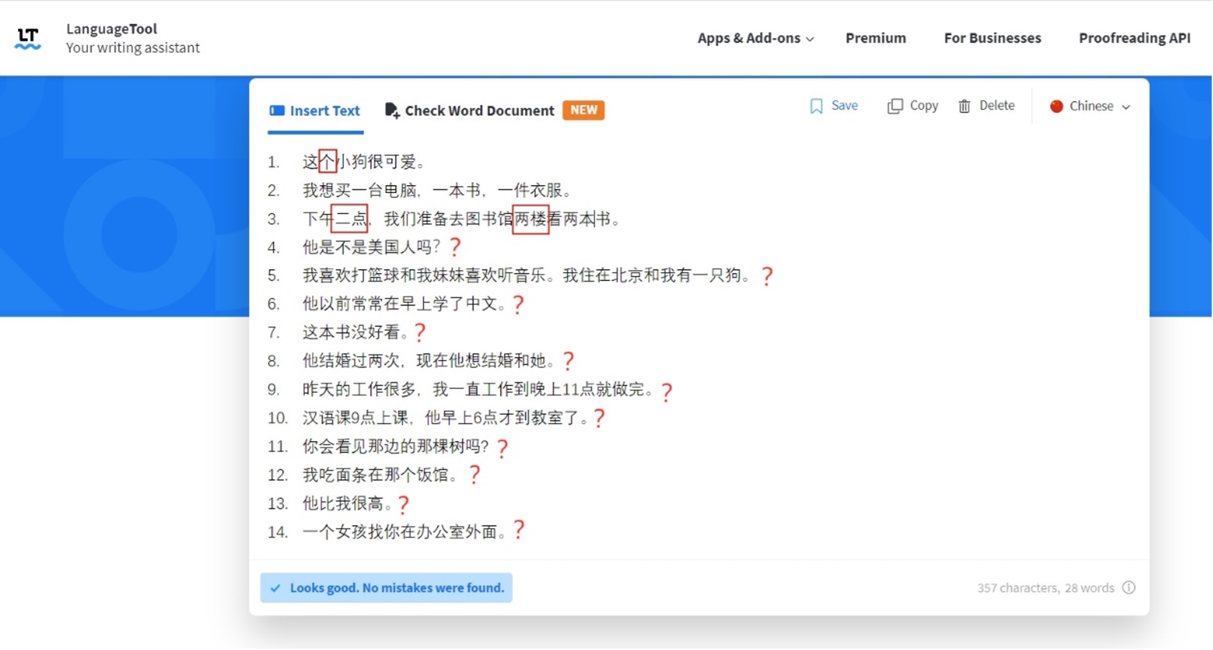 There are 20 errors and 14 types of common grammar mistakes in these test sentences. Let’s take a look at the performance of the following online Chinese grammar checkers.