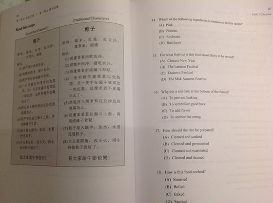 Firstly, this book contains an introduction in English, Traditional and Simplified characters explaining how to use this book according to the AP Chinese class curriculum. The book is divided into 8 “Units”:Customs, Daily Life,Economics,Education, Entertainment,Family, Geography and the Mixed Theme. Each chapter contains a test on their subject. This test is divided into reading and listening comprehension, which is to be used along with the free audio downloads that come with the book. The reading comprehension section of the test (shown below) is comprised of a textual passage in both Simplified and Traditional Characters, in which the student must then answer questions about the text read.