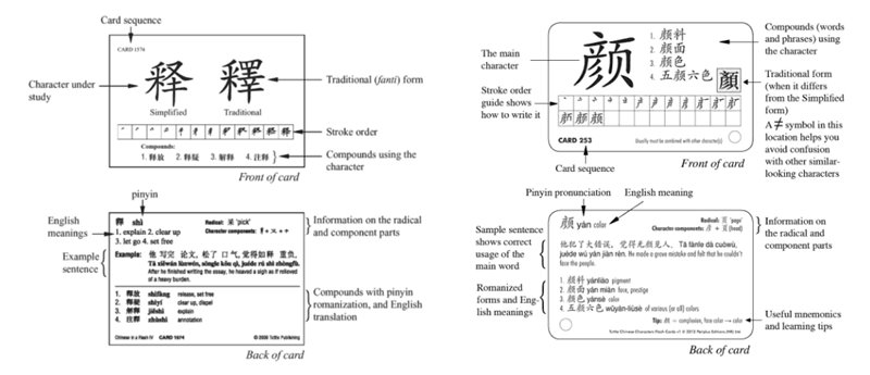 Developed with HSK study and AP test-prep in mind, the front of Tuttle’s Chinese Flash Cards give one Chinese character, a stroke order guide, four words and phrases, and look-alike alerts to help avoid confusion. On the reverse is as much information as a dictionary entry: Romanized pronunciation and English meanings, sample sentences for correct usage, plus helpful mnemonics and learning tips. An audio CD gives native-speaker pronunciations, and a handy organizing ring is the perfect way to keep the cards together when you’re on the go. Whether at home or on the go, you can use these cards to learn several new characters every day and watch your knowledge develop rapidly over time.