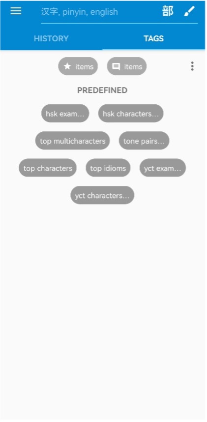Another Chinese-English dictionary with a range of practical and engaging features. Tags make it easier to locate word clusters. For instance, by selecting the “HSK exam” tag, you can access six levels of vocabulary. It is an excellent app to verify 儿化词(ér huà cí), and you can even import your own vocabulary file to personalize your tags.