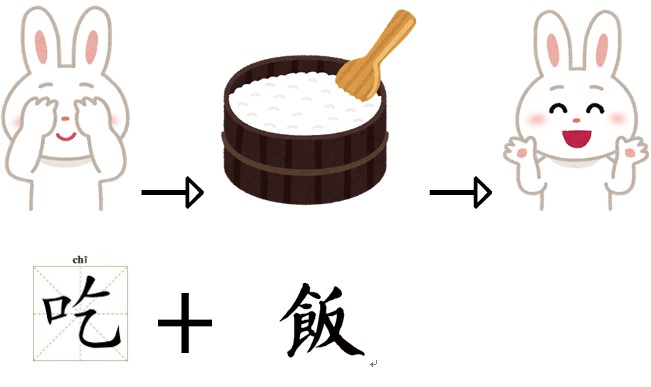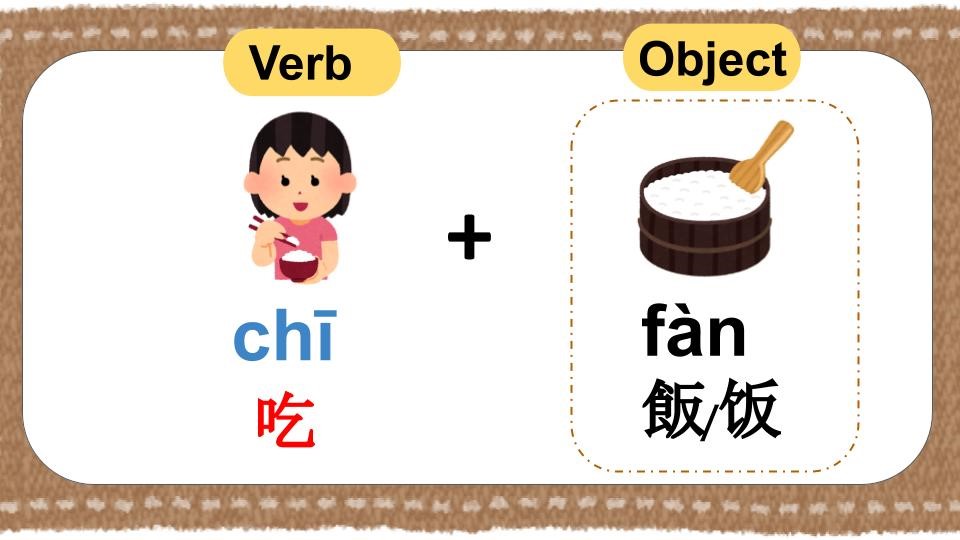 Verb (吃 eat) + Object (饭 rice/面 noodle/鱼肉 fish/鸡肉 chicken)