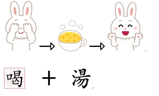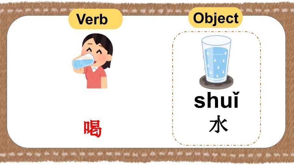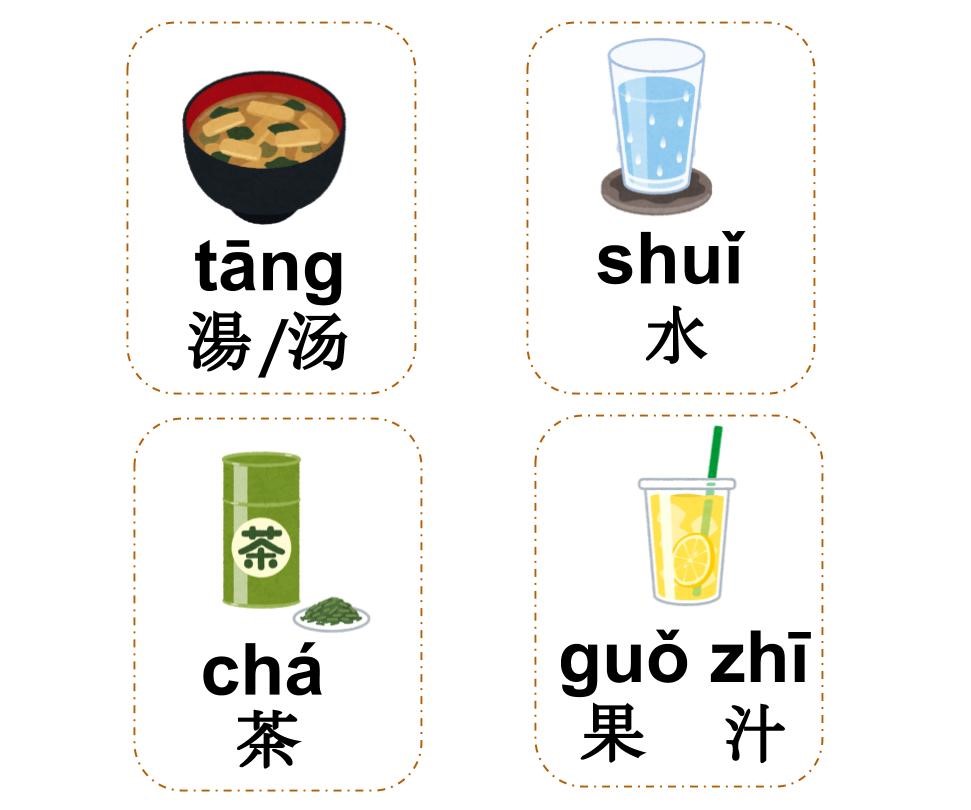 Verb (喝 drink) + Object (汤 soup/茶 tea/水 water/果汁 juice)