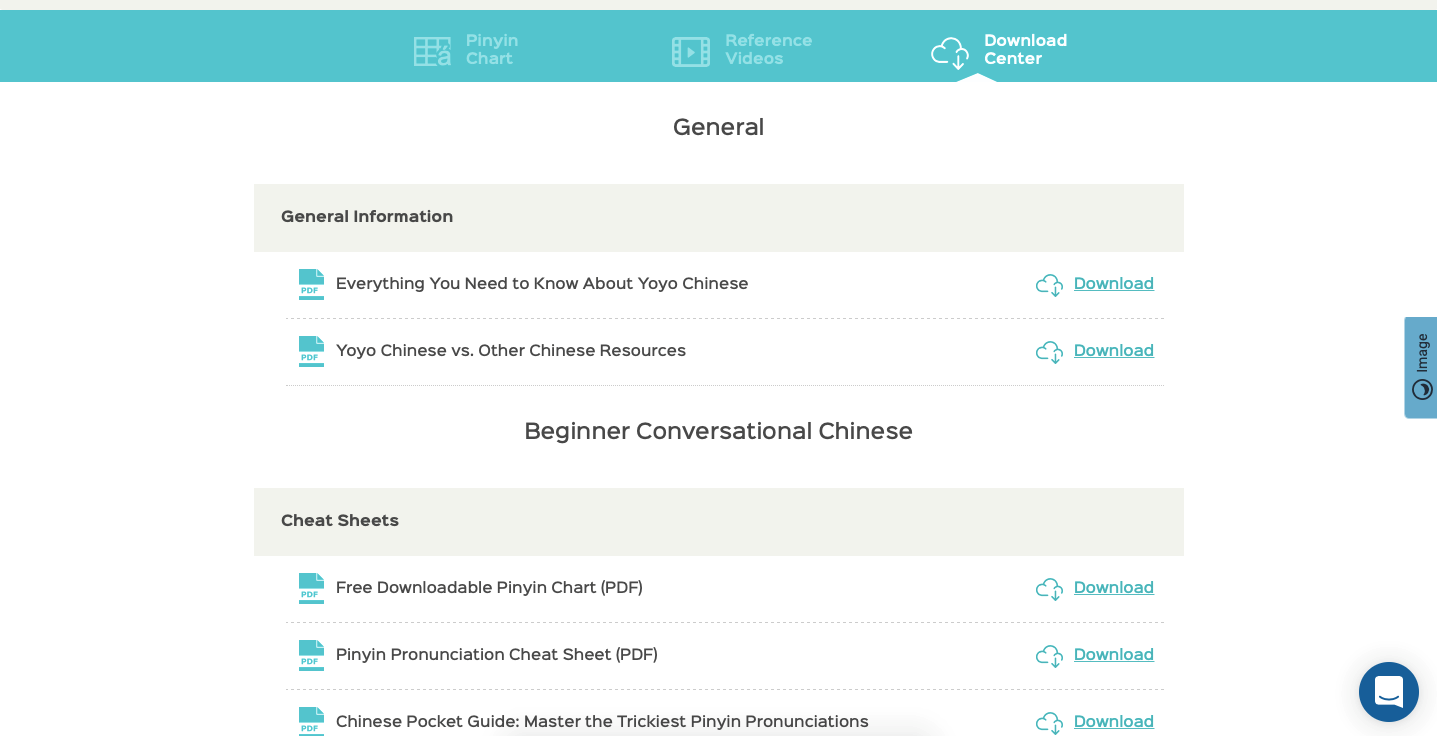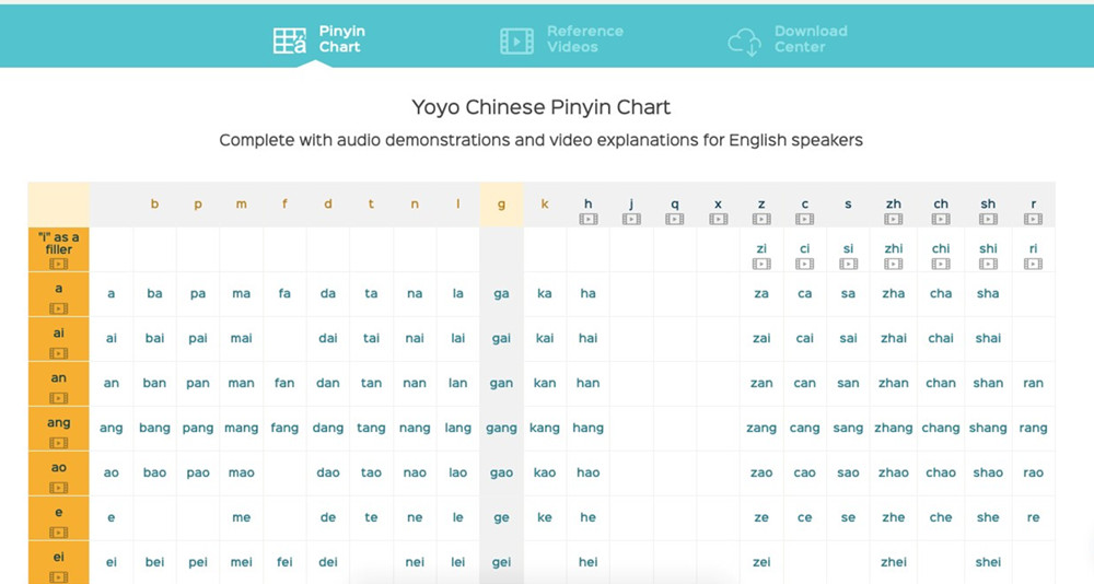 YoYo Chinese also has a really nice feature in terms of their resources. The resources page has three different options: The PinYin Chart, the Reference Videos, and The Download Center. The PinYin Chart is a comprehensive chart of all the different sounds found in Mandarin. It’s broken down by letter and ending. Each sound can also be clicked on. When clicking on it, you can listen to the sound spoken with all four of the different tones. It is a great resource to use for listening and practicing with speaking.