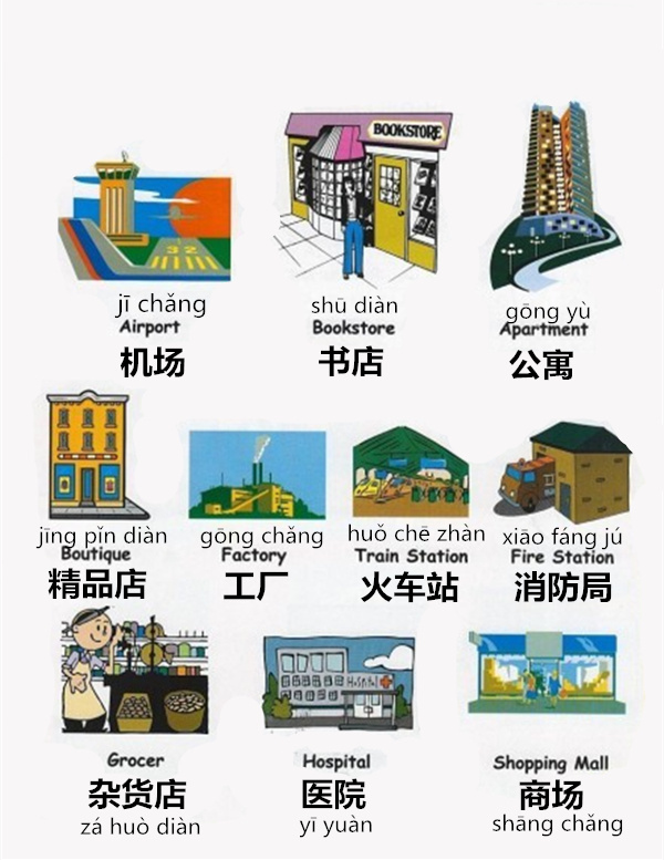 Learn Chinese Vocabulary in an Easy Way – Nouns Part 5 Last updated: June 19, 2015 Dig Mandarin Vocabulary English Chinese Pinyin Audio Airport 机场 jī chǎnɡ Bookstore 书店 shū diàn Apartment 公寓 ɡōnɡ yù Fire station 消防局 xiāo fánɡ jú Train station 火车站 huǒ chē zhàn Factory 工厂 ɡōnɡ chǎnɡ Boutique 精品店 jīnɡ pǐn diàn Grocer 杂货店 zá huò diàn Hospital 医院 yī yuàn Shopping mall 商场 shānɡ chǎnɡ Online Chinese Tutors 1:1 online tutoring 100% native professional tutors For all levels Flexible schedule More effective Learn more Dig Mandarin You May Also Like Learn Chinese Vocabulary in an Easy Way – Body part 6 Learn Chinese Vocabulary in an Easy Way – Body part 5 Learn Chinese Vocabulary in an Easy Way – Body part 4 Show 0 Comments Comments (0) Leave a Reply Cancel replyYour email address will not be published. Required fields are marked *Name * Email * Website Comment * Δ