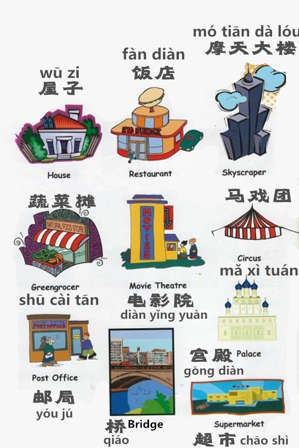 Learn Chinese Vocabulary in an Easy Way –Nouns Part 6 Last updated: June 19, 2015 Dig Mandarin Vocabulary English Chinese Pinyin Audio House 屋子 wū zi Restaurant 饭店 fàn diàn Restaurant 摩天大楼 mó tiān dà lóu Circus 马戏团 mǎ xì tuán Movie theater 电影院 diàn yǐnɡ yuàn Greengrocer 蔬菜摊 shū cài tān Post office 邮局 yóu jú Bridge 桥 qiáo Palace 宫殿 ɡōnɡ diàn Supermarket 超市 chāo shì Online Chinese Tutors 1:1 online tutoring 100% native professional tutors For all levels Flexible schedule More effective Learn more Dig Mandarin You May Also Like Learn Chinese Vocabulary in an Easy Way – Body part 6 Learn Chinese Vocabulary in an Easy Way – Body part 5 Learn Chinese Vocabulary in an Easy Way – Body part 4 Show 0 Comments Comments (0) Leave a Reply Cancel replyYour email address will not be published. Required fields are marked *Name * Email * Website Comment * Δ