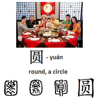 The last character for 家团圆, 圆, means “circle” and derives from a pictogram of a round enclosure or a round table with food on it, symbolizing completeness and reunion.