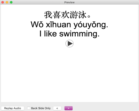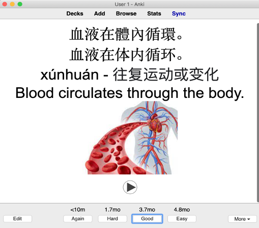 Like most flashcard platforms, Anki has pre-made decks in addition to ones you can make yourself. Other language learners can upload decks of flashcards they have made, saving you time and effort! One deck that I love is Spoonfed Chinese, which has thousands of example sentences in Chinese at various levels with native-speaker audio. Learning words in context is much more effective than simply memorizing words in isolation, and the clearly enunciated audio coupled with characters and pinyin allows you to practice listening and reading in one go! To work on pronunciation, I listen and repeat the sentences as I study them. Another benefit of this deck is that it has content suitable for all levels. There are beginner and intermediate level sentences like, ”我喜欢游泳 – I like swimming.“ Once you get more advanced, you can learn more specific vocab and grammar patterns, such as those related to economics or politics. For example, “如何克服日元升高是个大问题 – How to overcome the high value of yen is a big problem.” To customize these cards, you can add extra information about the definitions of words used in the sentence or pictures.