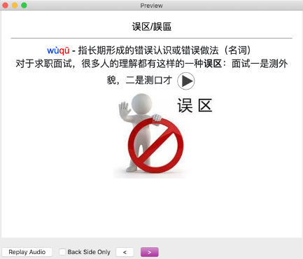 Next, I would like to share my method of making my own flashcards to expand my Chinese vocabulary and work on my pronunciation. Studying one’s own flashcards is not only a great way to review vocab words, but the actual process of making the cards can help you better acquire the words in and of themselves. I use the word “误区(wù qū) – mistaken ideas” as an example; it was a vocab word I learned in one of my readings from class. On the front side, I have the characters (in both simplified and traditional since my goal is to be able to read both). The second side has the pinyin, a definition in Chinese (but for beginners or intermediate learners it could be in English), the part(s) of speech, example sentence(s) or phrase(s), and a picture. I record the audio for my example sentences myself so that I can practice saying the words––both in isolation and in the context of a sentence. I can compare my pronunciation to how I know the tones should sound. It is an especially great way to track your progress in pronunciation since you can listen back to recordings from a few months ago to see how you’ve improved! For learners just starting out, it is important to have feedback from a native speaker to ensure that you are practicing the correct pronunciation, otherwise you may be practicing bad pronunciation habits. You can also find audio from native speakers for example sentences to record or imitate on websites like Youglish.