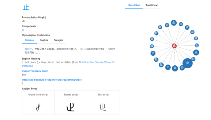 This is a kind of Chinese character dictionary. Besides Pinyin, there are also etymological explanations in Chinese, English, and French. It also shows you the ancient versions of each character. The fun part is that it generates a graph with branches of related characters. You might find several other related characters to learn and distinguish between.