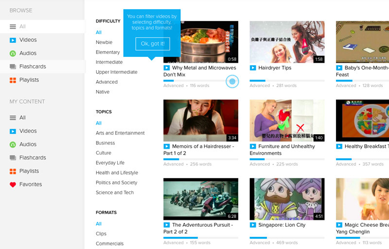 - You can browse the video and audio libraries by different topics, different formats or by the difficulty of the content.