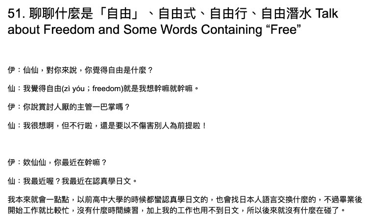 This Taiwan-based podcast, available on YouTube and Apple Podcasts, is designed for intermediate and advanced learners. Host Abbey speaks at a faster pace, tackling complex and engaging topics. Episodes up to number 65 include free worksheets that explain new vocabulary and grammar in detail. Beyond that, you’ll need to sign up on the website’s Patreon to access the worksheets. While the podcast is enjoyable, I wish the experience lasted longer, as each episode is typically just under 10 minutes.